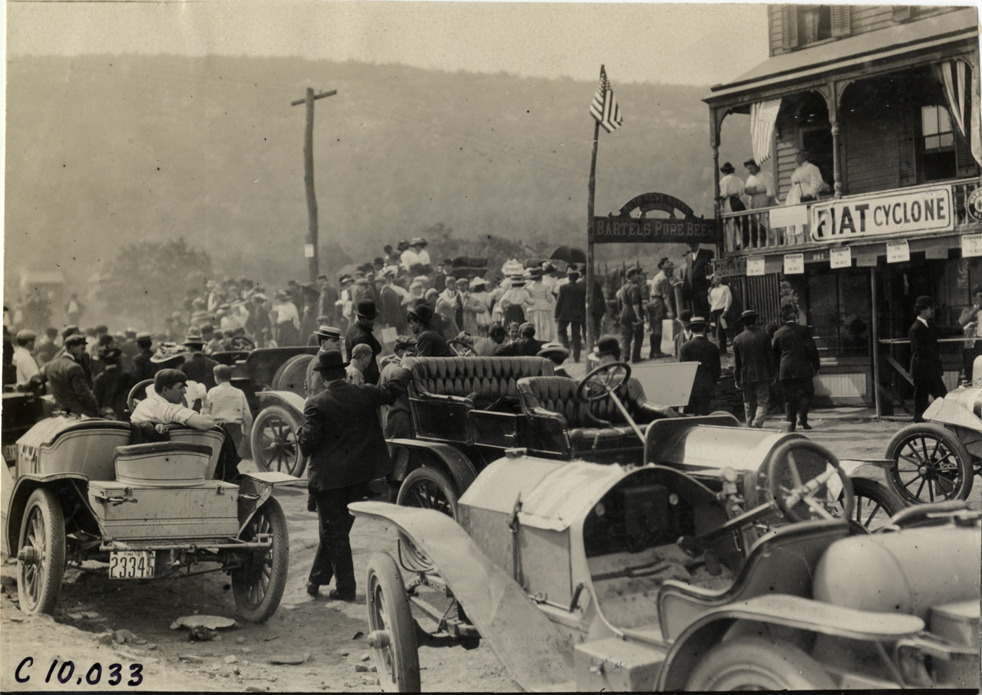 View of spectators and racecars at 1909 Giant's Despair Hill Climb in Wilkes-Barre, Pennsylvania. Signs for Fiat Cyclone and Bartel's pure beer on building in background. Handwritten on back: "Hill Climbs--Giant's Despair Hill Climb, 1909."