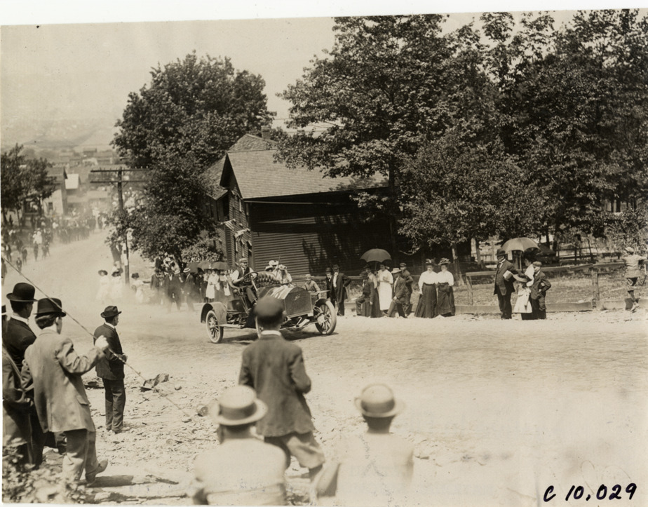View of driver in racecar at 1909 Giant's Despair Hill Climb in Wilkes-Barre, Pennsylvania. Spectators watch from roadside. Stamped on back: "Spooner & Wells, Inc., photographers, telephones 3472-3473 Columbus, 1931 Broadway, New York." Handwritten on back: "Hill Climbs--Giant's Despair Hill Climb, 1909."