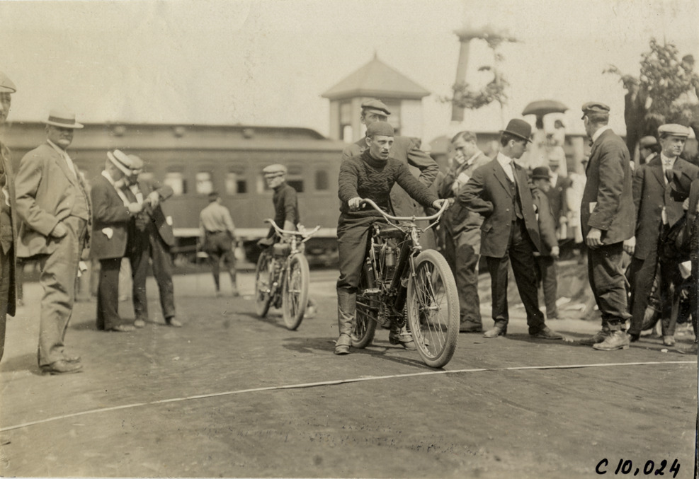 View of man on motorcycle at 1909 Giant's Despair Hill Climb in Wilkes-Barre, Pennsylvania. Spectators and another motorcyclist in background. Stamped on back: "Spooner & Wells, Inc., photographers, telephones 3472-3473 Columbus, 1931 Broadway, New York." Handwritten on back: "Hill Climbs--Giant's Despair Hill Climb, 1909."