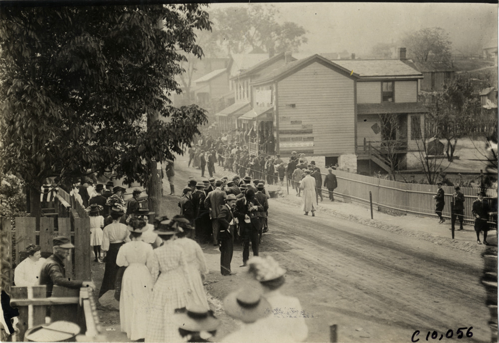 View of spectators at 1909 Giant's Despair Hill Climb in Wilkes-Barre, Pennsylvania. Wooden-frame buildings in background. Stamped on back: "Spooner & Wells, Inc., photographers, telephones 3472-3473 Columbus, 1931 Broadway, New York." Handwritten on back: "Hill Climbs--Giant's Despair Hill Climb, 1909."