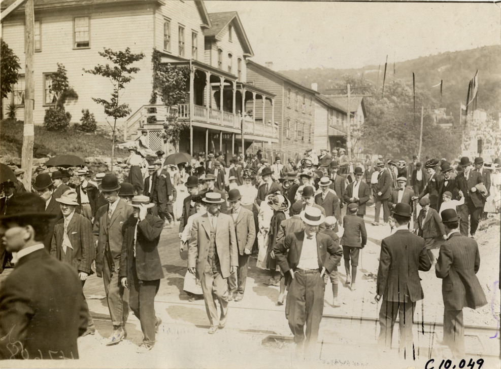 View of spectators at 1909 Giant's Despair Hill Climb in Wilkes-Barre, Pennsylvania. Wooden-frame buildings in background. Stamped on back: "Spooner & Wells, Inc., photographers, telephones 3472-3473 Columbus, 1931 Broadway, New York." Handwritten on back: "Hill Climbs--Giant's Despair Hill Climb, 1909."