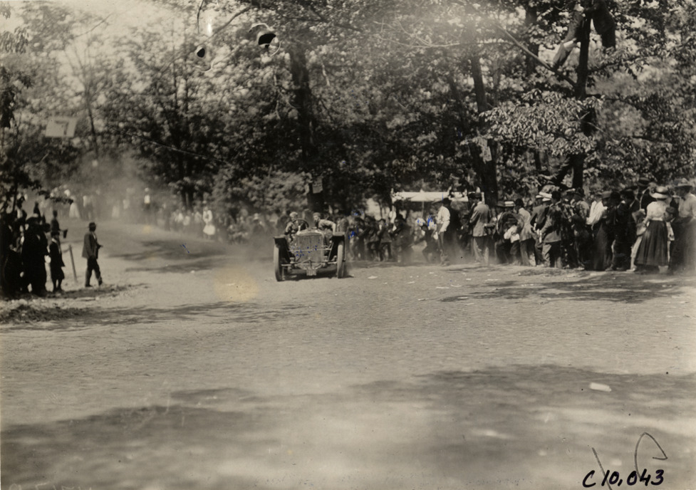 View of driver and passenger in racecar at 1909 Giant's Despair Hill Climb in Wilkes-Barre, Pennsylvania. Spectators watch from roadside. Stamped on back: "Spooner & Wells, Inc., photographers, telephones 3472-3473 Columbus, 1931 Broadway, New York." Handwritten on back: "Hill Climbs--Giant's Despair Hill Climb, 1909."