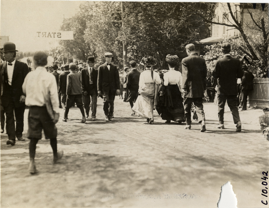 View of spectators at 1909 Giant's Despair Hill Climb in Wilkes-Barre, Pennsylvania. "Start" banner suspended over road in background. Stamped on back: "Spooner & Wells, Inc., photographers, telephones 3472-3473 Columbus, 1931 Broadway, New York." Handwritten on back: "Hill Climbs--Giant's Despair Hill Climb, 1909."