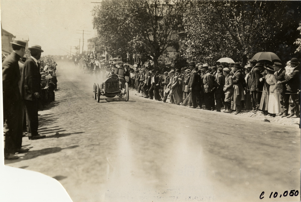 View of driver in Fiat racecar at 1909 Giant's Despair Hill Climb in Wilkes-Barre, Pennsylvania. Spectators watch from roadside. Stamped on back: "Spooner & Wells, Inc., photographers, telephones 3472-3473 Columbus, 1931 Broadway, New York." Handwritten on back: "Hill Climbs--Giant's Despair Hill Climb, 1909."