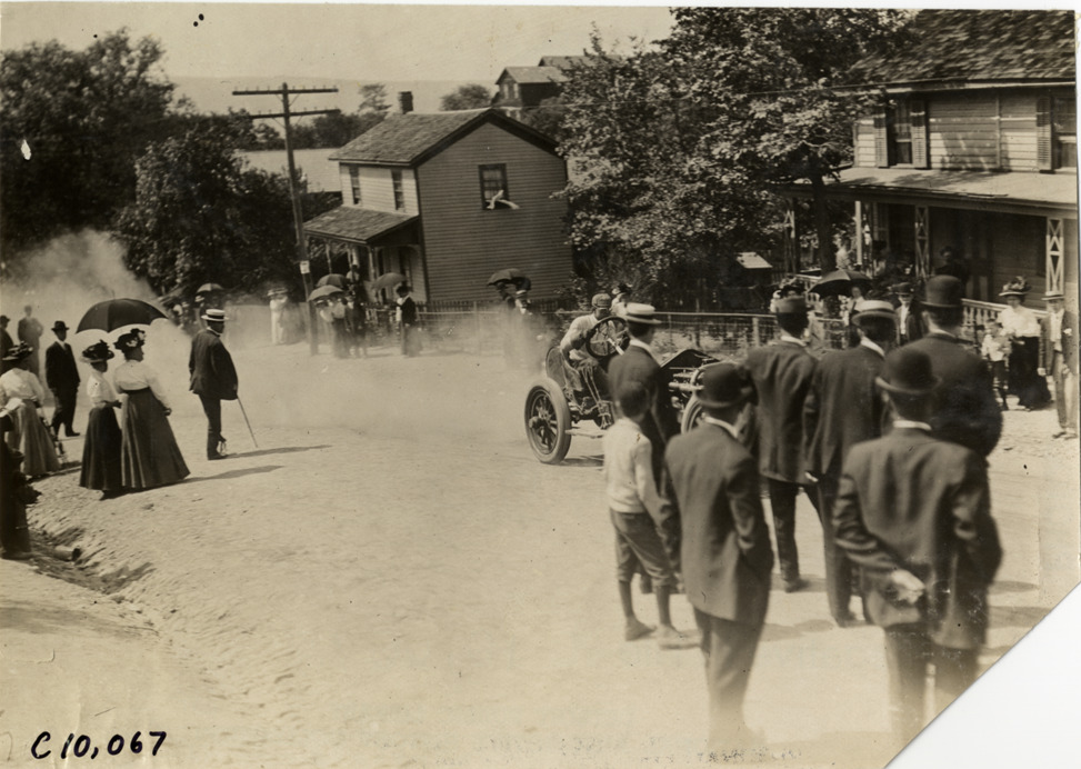 View of driver in racecar at 1909 Giant's Despair Hill Climb in Wilkes-Barre, Pennsylvania. Spectators watch from roadside; houses in background. Stamped on back: "Spooner & Wells, Inc., photographers, telephones 3472-3473 Columbus, 1931 Broadway, New York." Handwritten on back: "Hill Climbs--Giant's Despair Hill Climb, 1909."