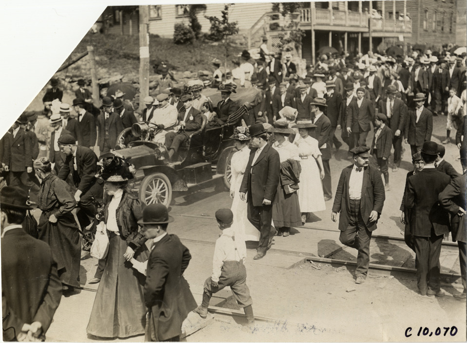 Spectators and racecars, 1909 Giant's Despair Hill Climb