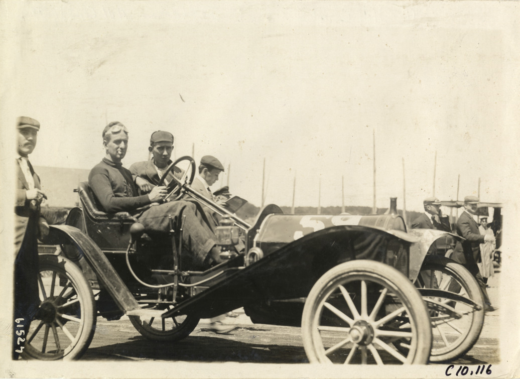 View of driver in car no. 59 at 1910 Port Jefferson Hill Climb in Port Jefferson, Long Island, New York. Stamped on back: "Spooner & Wells, Inc., photographers, telephones 3472-3473 Columbus, 1931 Broadway, New York." Handwritten on back: "Hill Climbs--Port Jefferson Hill Climb, 1910."
