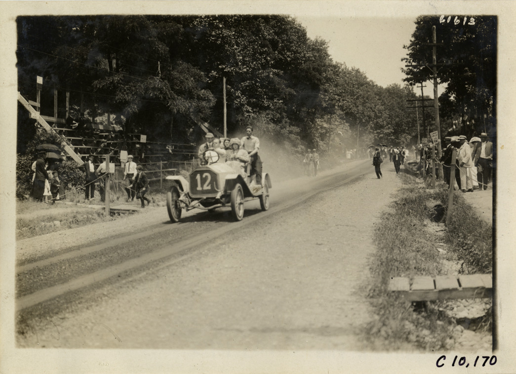 View of driver and passengers in car no. 12 at 1910 Port Jefferson Hill Climb in Port Jefferson, Long Island, New York. Spectators watch from roadside. Stamped on back: "Spooner & Wells, Inc., photographers, telephones 3472-3473 Columbus, 1931 Broadway, New York." Handwritten on back: "Hill Climbs--Port Jefferson Hill Climb, 1910."