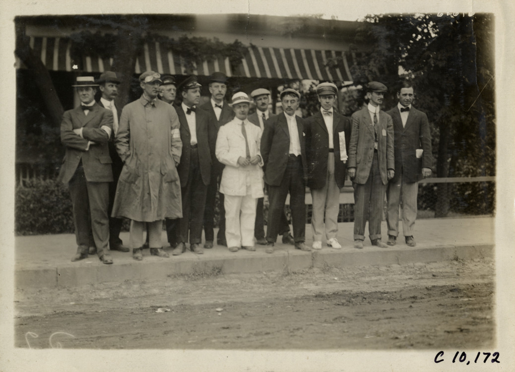 Group portrait of racing officials at 1910 Port Jefferson Hill Climb in Port Jefferson, Long Island, New York. Stamped on back: "Spooner & Wells, Inc., photographers, telephones 3472-3473 Columbus, 1931 Broadway, New York." Handwritten on back: "Hill Climbs--Port Jefferson Hill Climb, 1910."