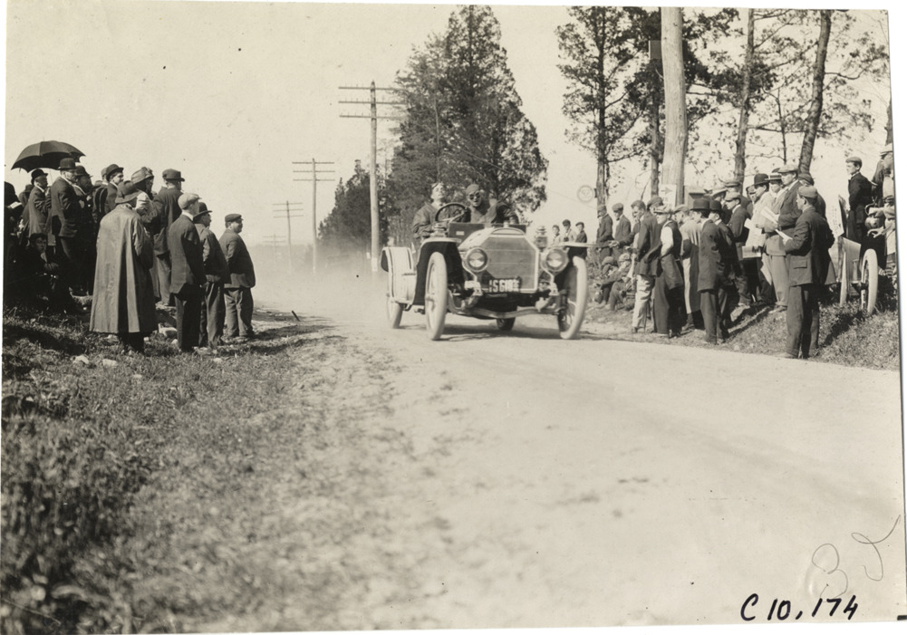 View of driver and passenger in racecar at 1909 Shingle Hill Climb in West Haven, Connecticut. Spectators watch from roadside. Handwritten on back: "Hill Climbs--Shingle Hill Climb, 1909."