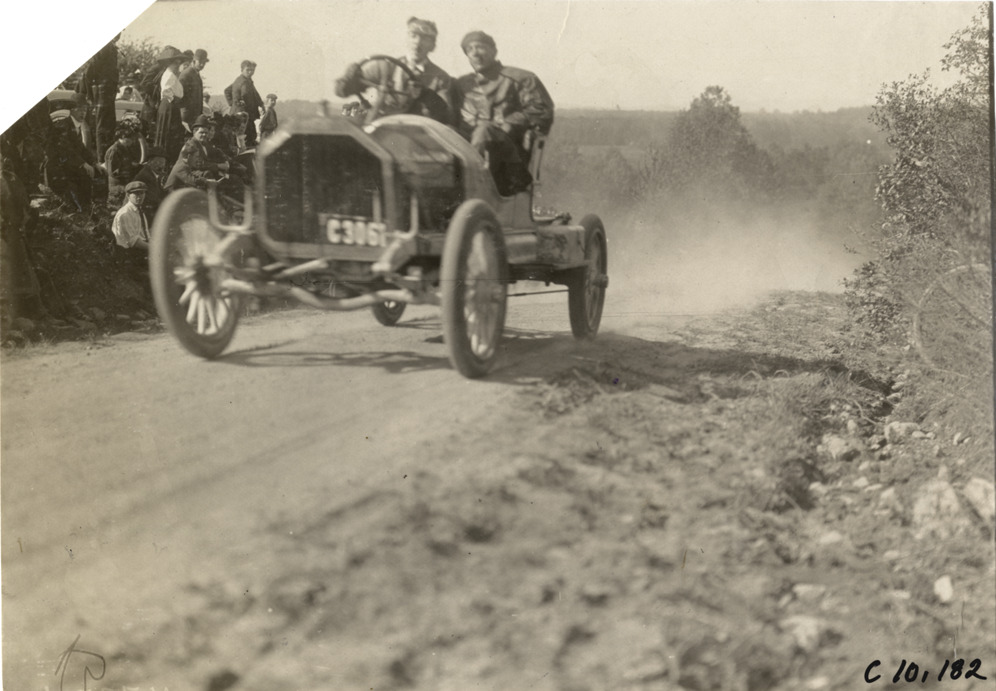 View of driver and passenger in racecar at 1909 Shingle Hill Climb in West Haven, Connecticut. Spectators watch from roadside. Stamped on back: "Spooner & Wells, Inc., photographers, telephones 3472-3473 Columbus, 1931 Broadway, New York." Handwritten on back: "Hill Climbs--Shingle Hill Climb, 1909."