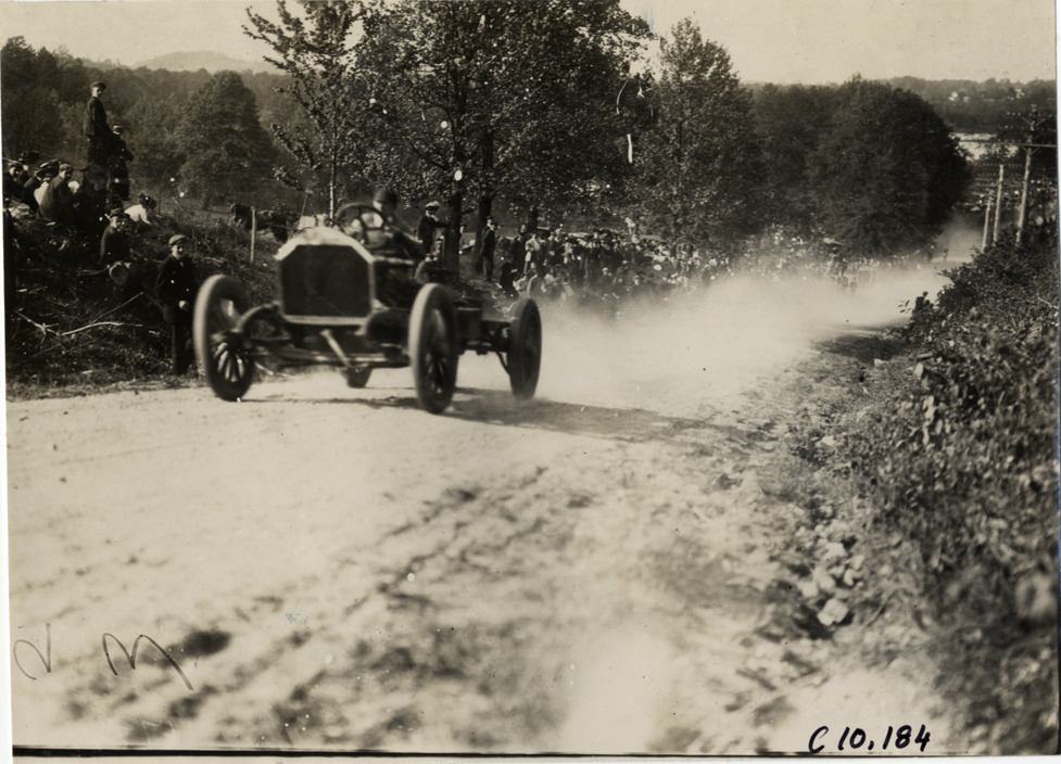 View of driver in racecar at 1909 Shingle Hill Climb in West Haven, Connecticut. Spectators watch from roadside. Stamped on back: "Spooner & Wells, Inc., photographers, telephones 3472-3473 Columbus, 1931 Broadway, New York." Handwritten on back: "Hill Climbs--Shingle Hill Climb, 1909."