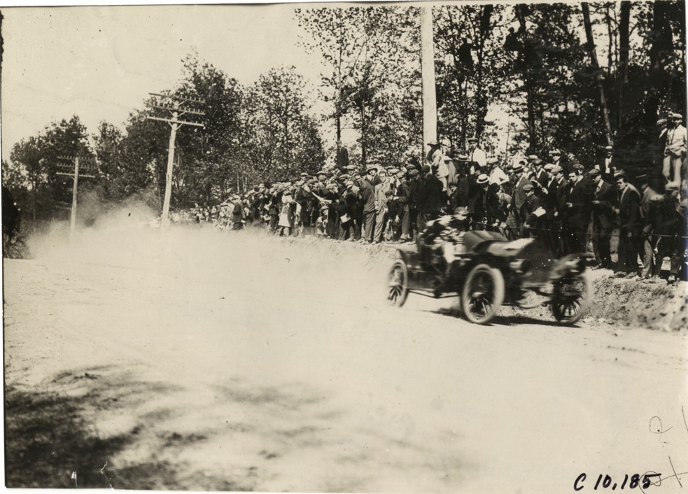 View of driver in racecar at 1909 Shingle Hill Climb in West Haven, Connecticut. Spectators watch from roadside. Stamped on back: "Spooner & Wells, Inc., photographers, telephones 3472-3473 Columbus, 1931 Broadway, New York." Handwritten on back: "Hill Climbs--Shingle Hill Climb, 1909."
