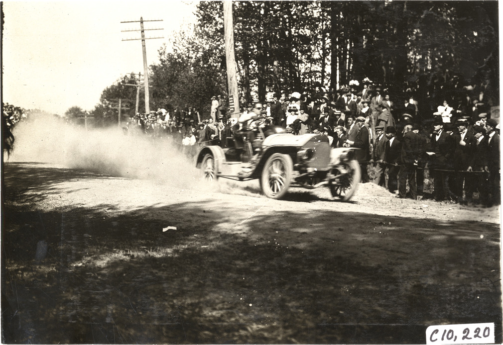 View of driver in Knox racecar at 1909 Shingle Hill Climb in West Haven, Connecticut. Spectators watch from roadside. Stamped on back: "Spooner & Wells, Inc., photographers, telephones 3472-3473 Columbus, 1931 Broadway, New York." Handwritten on back: "Hill Climbs--Shingle Hill Climb, 1909. Knox."