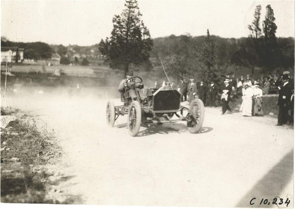 View of driver in Knox racecar at 1909 Shingle Hill Climb in West Haven, Connecticut. Spectators watch from roadside. Stamped on back: "Spooner & Wells, Inc., photographers, telephones 3472-3473 Columbus, 1931 Broadway, New York." Handwritten on back: "Hill Climbs--Shingle Hill Climb, 1909. Knox."
