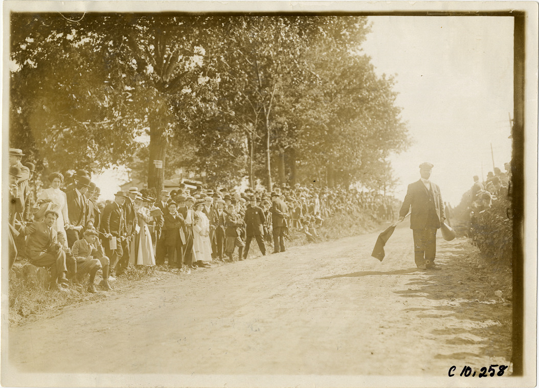 View of spectators and racing official holding flag and megaphone at 1910 Shingle Hill Climb in West Haven, Connecticut. Stamped on back: "Spooner & Wells, Inc., photographers, telephones 3472-3473 Columbus, 1931 Broadway, New York." Handwritten on back: "Hill Climbs--Shingle Hill Climb, 1910."