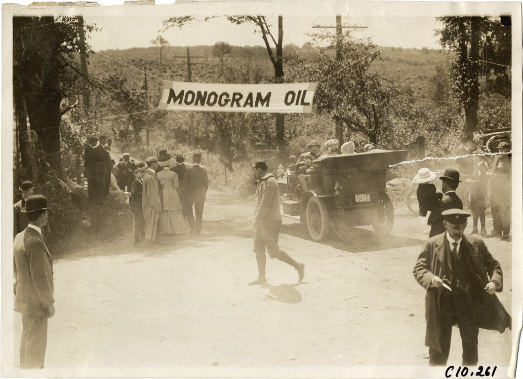 View of motorists in car and spectators near Monogram oil banner suspended over road at 1910 Shingle Hill Climb in West Haven, Connecticut. Stamped on back: "Spooner & Wells, Inc., photographers, telephones 3472-3473 Columbus, 1931 Broadway, New York." Handwritten on back: "Hill Climbs--Shingle Hill Climb, 1910."