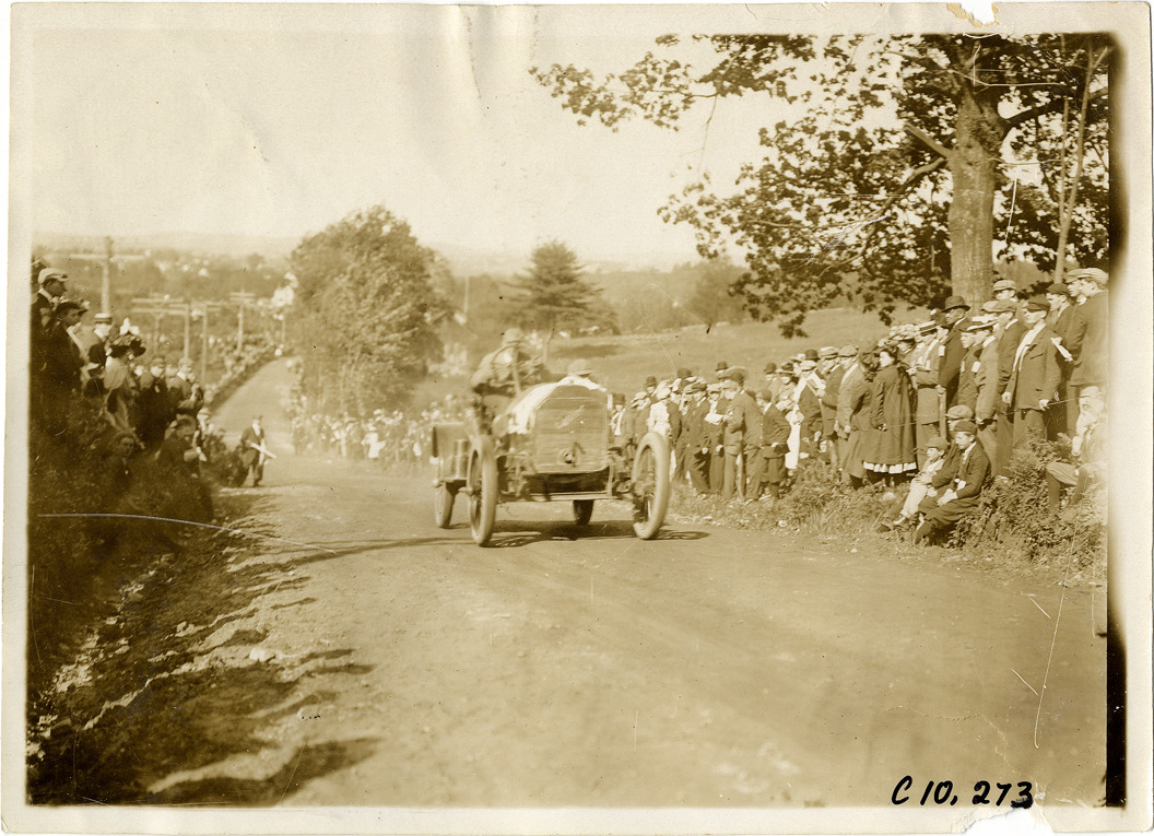 View of driver in racecar at 1910 Shingle Hill Climb in West Haven, Connecticut. Spectators watch from roadside. Stamped on back: "Spooner & Wells, Inc., photographers, telephones 3472-3473 Columbus, 1931 Broadway, New York." Handwritten on back: "Hill Climbs--Shingle Hill Climb, 1910."