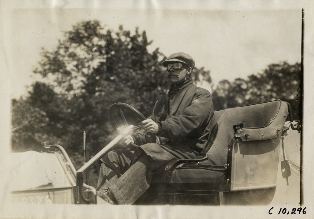 Close-up view of driver in racecar at 1910 White Plains Hill Climb at Anderson Hill in White Plains, New York. Stamped on back: "Spooner & Wells, Inc., photographers, telephones 3472-3473 Columbus, 1931 Broadway, New York." Handwritten on back: "Hill Climbs--White Plains Hill Climb, 1910."
