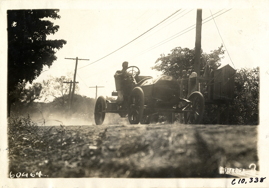 View of driver in racecar passing in front of reviewing stand at 1910 White Plains Hill Climb at Anderson Hill in White Plains, New York. Stamped on back: "Spooner & Wells, Inc., photographers, telephones 3472-3473 Columbus, 1931 Broadway, New York." Handwritten on back: "Hill Climbs--White Plains Hill Climb, 1910."