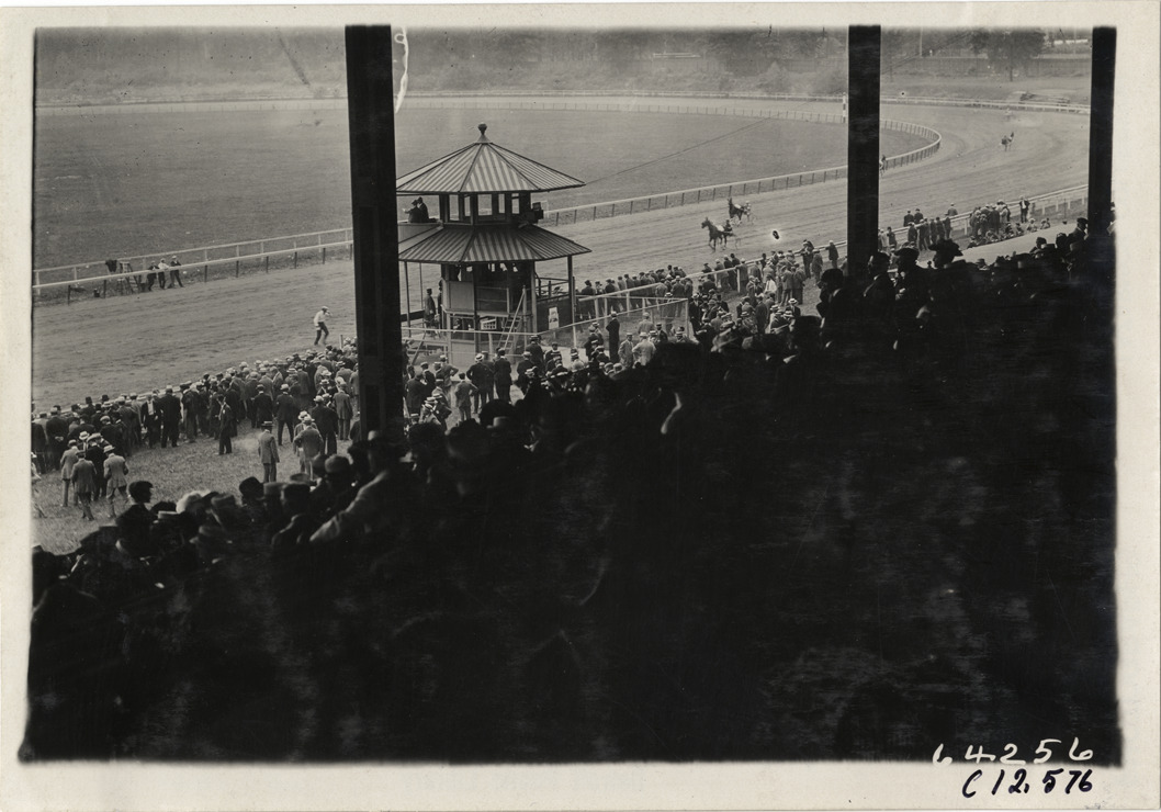 View from grandstand of harness race and reviewing stand at Empire City track in Yonkers, New York. Spectators watch race from grandstand and edge of racetrack. Stamped on back: "Spooner & Wells, Inc., photographers, telephones 3472-3473 Columbus, 1931 Broadway, New York." Handwritten on back: "Horse-racing--Empire City, 1910."