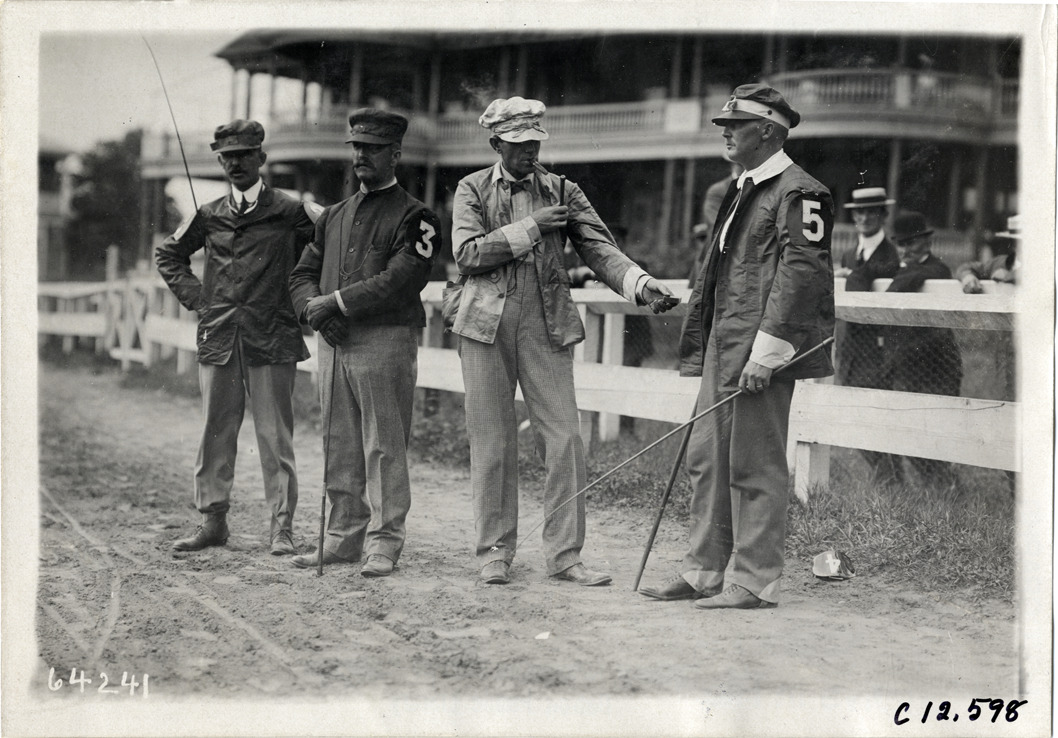 View of four harness drivers holding riding crops at Empire City racetrack in Yonkers, New York. Stamped on back: "Spooner & Wells, Inc., photographers, telephones 3472-3473 Columbus, 1931 Broadway, New York." Handwritten on back: "Horse-racing--Empire City, 1910."