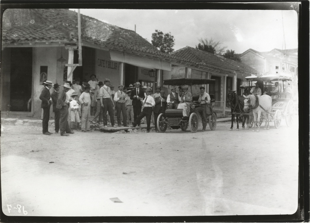 View of small crowd gathering in front of Mission-style building with car and horse-drawn wagon. "Cafe y billar" painted on building facade. Stamped on back: "Photographic illustration by Nick Lazarnick, 230 Park Ave., N.Y." Handwritten on back: "Horses."
