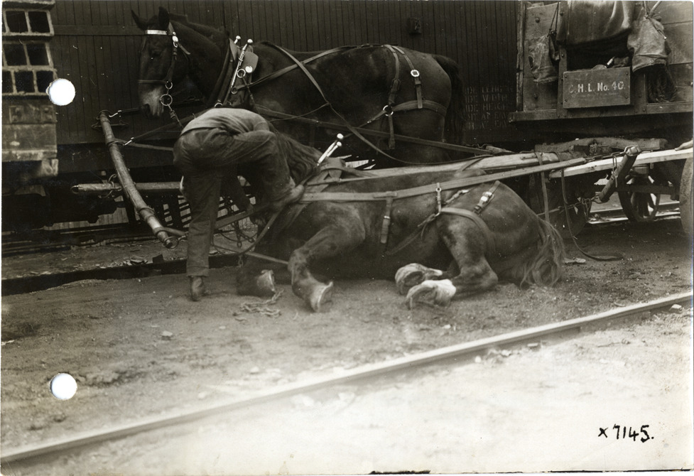 Favorite this☆ Man tending to fallen horse on Dequindre Street Description: View of man tending to fallen horse pulling horse-drawn wagon on Dequindre Street. Stamped on back: "Spooner & Wells, Inc., photographers, 1231 Woodward Ave., Detroit, Mich., telephone North 1745." Handwritten on back: "Horses. Taken on Dequindre." Details Resource ID: na008627 Creator: Spooner & Wells Subject: Horses--Michigan--Detroit Horse-drawn vehicles--Michigan--Detroit Photographers--Michigan--Detroit Photographic prints Date Issued: Unknown year Format: 1 photographic print ; 4.5 x 6.5 in. Member of: National Automotive History Collection Lazarnick Collection Filing Location: Horses Rights: Physical rights are retained by DPL. Copyright is retained in accordance with U.S. copyright laws.