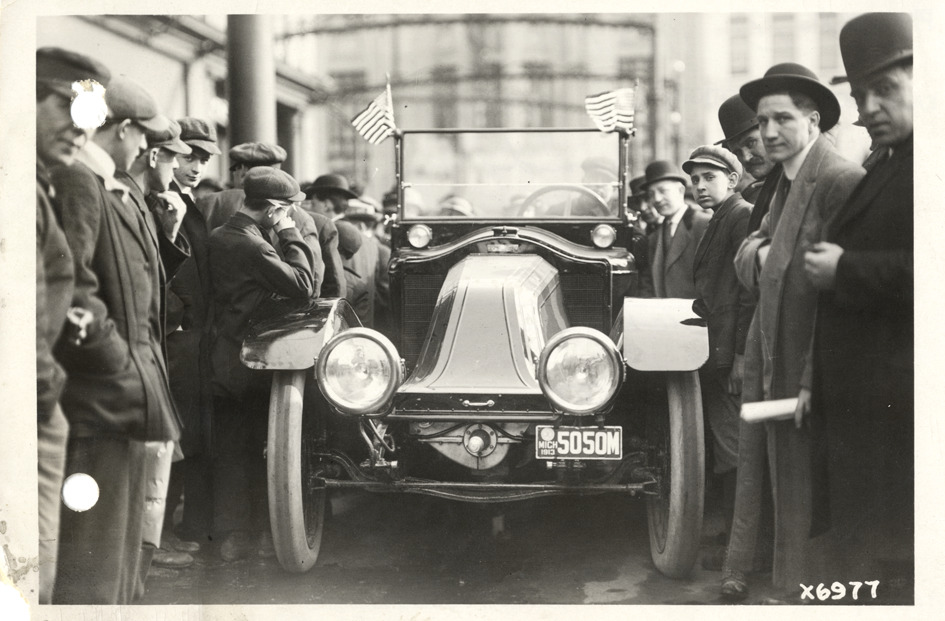 Crowd surrounding 1913 Keeton automobile in front of Hotel Pontchartrain
