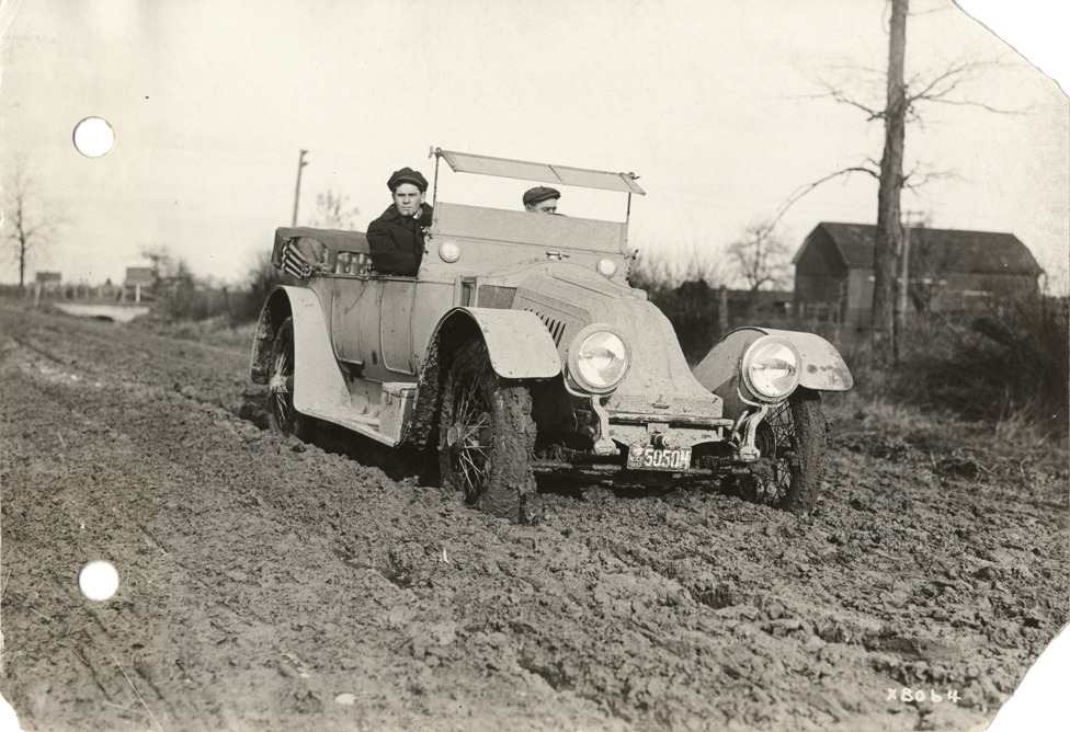 View of driver and passenger in Keeton on muddy rural road. Barn in background. Handwritten on back: "Keeton, 1913. Car on country road. Taken for Keeton Motor Co., 1913."