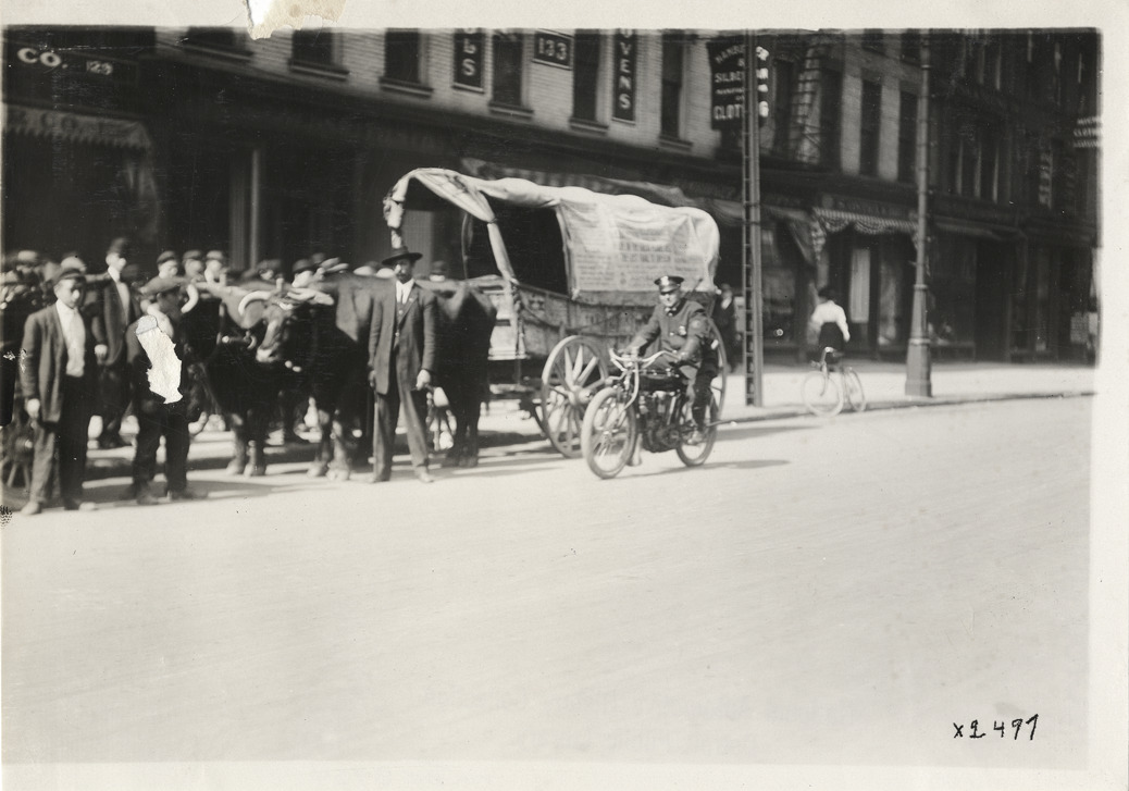 Favorite this☆ Motorcycle policeman and covered wagon Description: View of police officer on motorcycle and covered wagon or prairie schooner pulled by oxen team. Onlookers stand on sidewalk; 1911 King car not visible in frame. Handwritten on back: "King, 1911." Details Resource ID: na008754 Subject: Motorcycle police--Michigan--Detroit Motorcycles--Michigan--Detroit King Motor Car Company (Detroit, Mich.) Photographic prints Date Issued: Unknown year Format: 1 photographic print ; 5 x 7 in. Member of: National Automotive History Collection Lazarnick Collection Filing Location: King, 1911 Rights: Physical rights are retained by DPL. Copyright is retained in accordance with U.S. copyright laws.