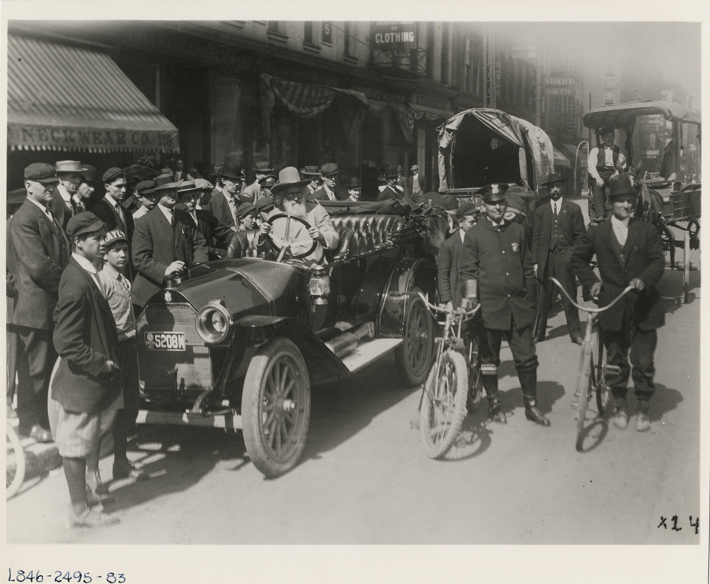 View of Ezra Meeker in 1911 King car, parked on street in front of Detroit Neckwear Co. Police officer with motorcycle stands next to man with bicycle in foreground; covered wagon or prairie schooner pulled by oxen in background. Onlookers stand on sidewalk. Handwritten on back: "King, 1911."