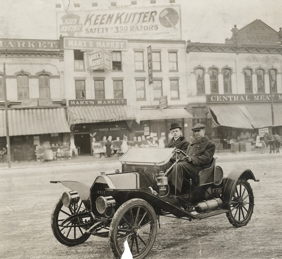 View of Mr. Crittenden and passenger posing in 1910 Krit car, parked in front of Marx's Market. Billboard for Keen Kutter safety razors in background. Handwritten on back: "Krit, 1910."