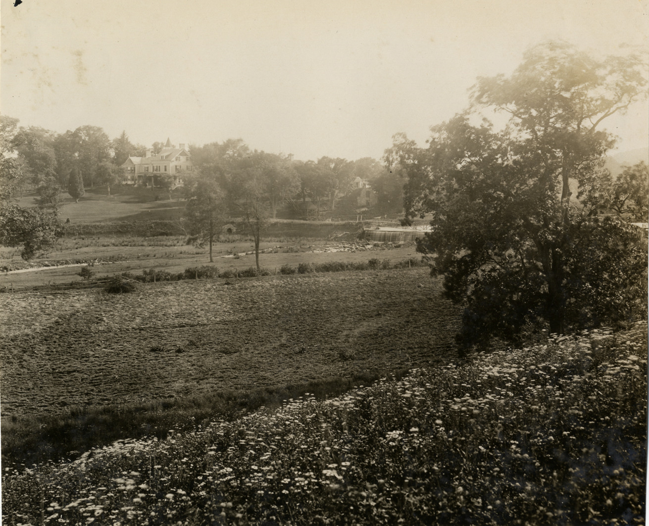 View of large, wooden-frame house overlooking waterfall and fields. Handwritten on back: "Landscapes, 1906."