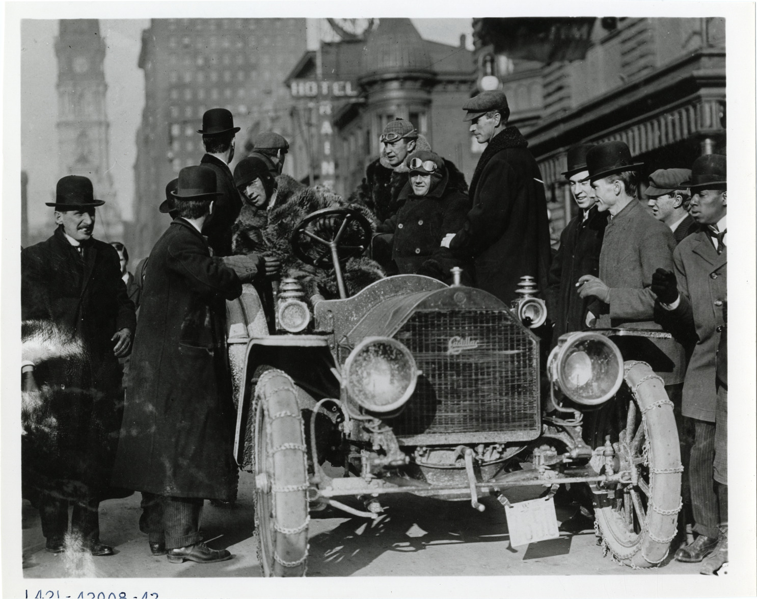 Favorite this☆ Crowd surrounding driver and passenger in Cadillac automobile Description: View of group of men surrounding driver and passenger in Cadillac car. Driver wears fur coat; chains on front tires. Handwritten on back: "Cadillac." Details Resource ID: na008838 Subject: Cadillac automobile Fur garments Photographic prints Date Issued: Unknown year Format: 1 photographic print ; 8 x 10 in. Member of: National Automotive History Collection Lazarnick Collection Filing Location: Cadillac Rights: Physical rights are retained by DPL. Copyright is retained in accordance with U.S. copyright laws.