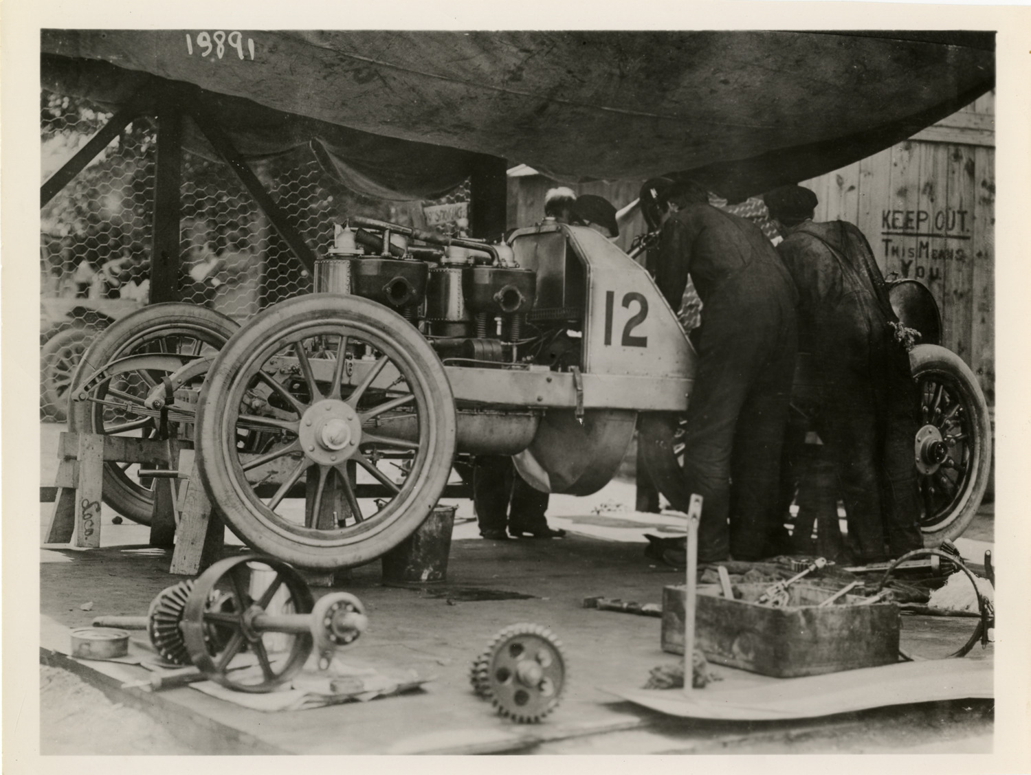 View of mechanics working on Locomobile racecar no. 12 at 1906 Vanderbilt Cup eliminations. Automobile parts in foreground. Handwritten on back: "Locomobile. 1906 Vanderbilt eliminations, Joe Troy, driver."