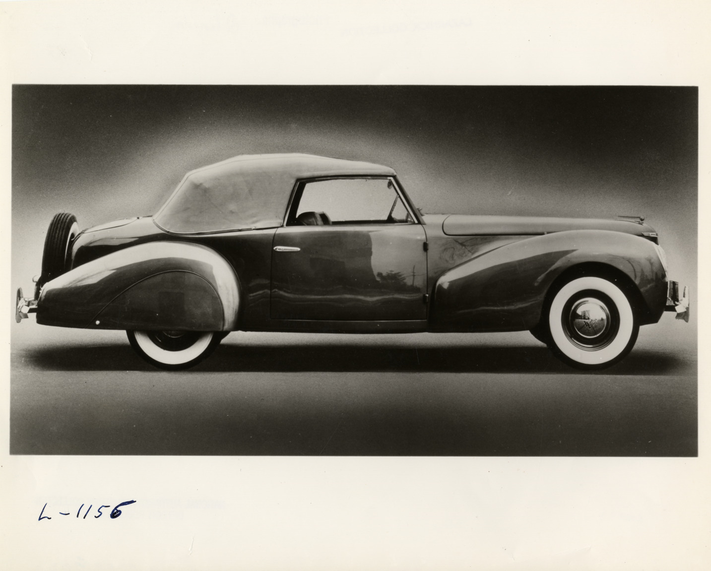 View 1940 Lincoln car. Typed on back: "The original prototype of the Lincoln-Continental, built in 1939 (as a 1940 model) under the direction of the late Edsel Ford when he was president of Ford Motor Company. The car has a V-12 engine and was made in two body styles, coupe--hardtop and cabriolet (convertible). The first Lincoln-Continental was less than 62 inches high." Handwritten on back: "Lincoln."