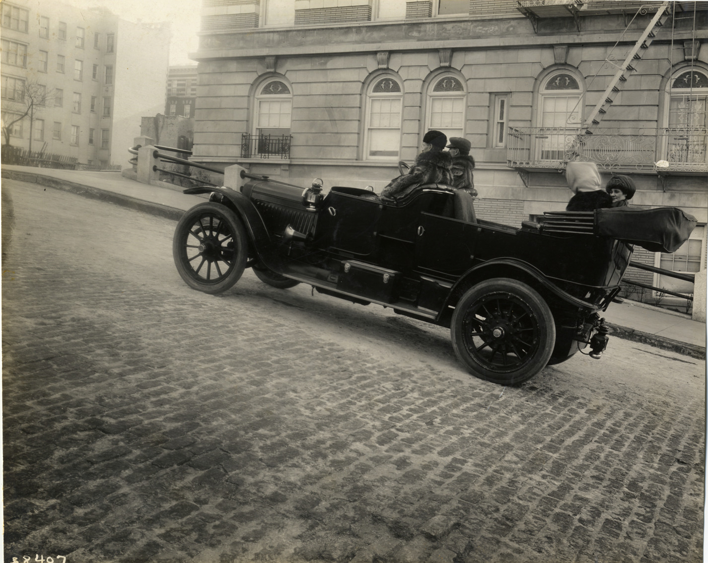 View of motorists in 1911 Lozier car driving uphill on brick road; buildings in background. Handwritten on back: "Lozier, 1911."
