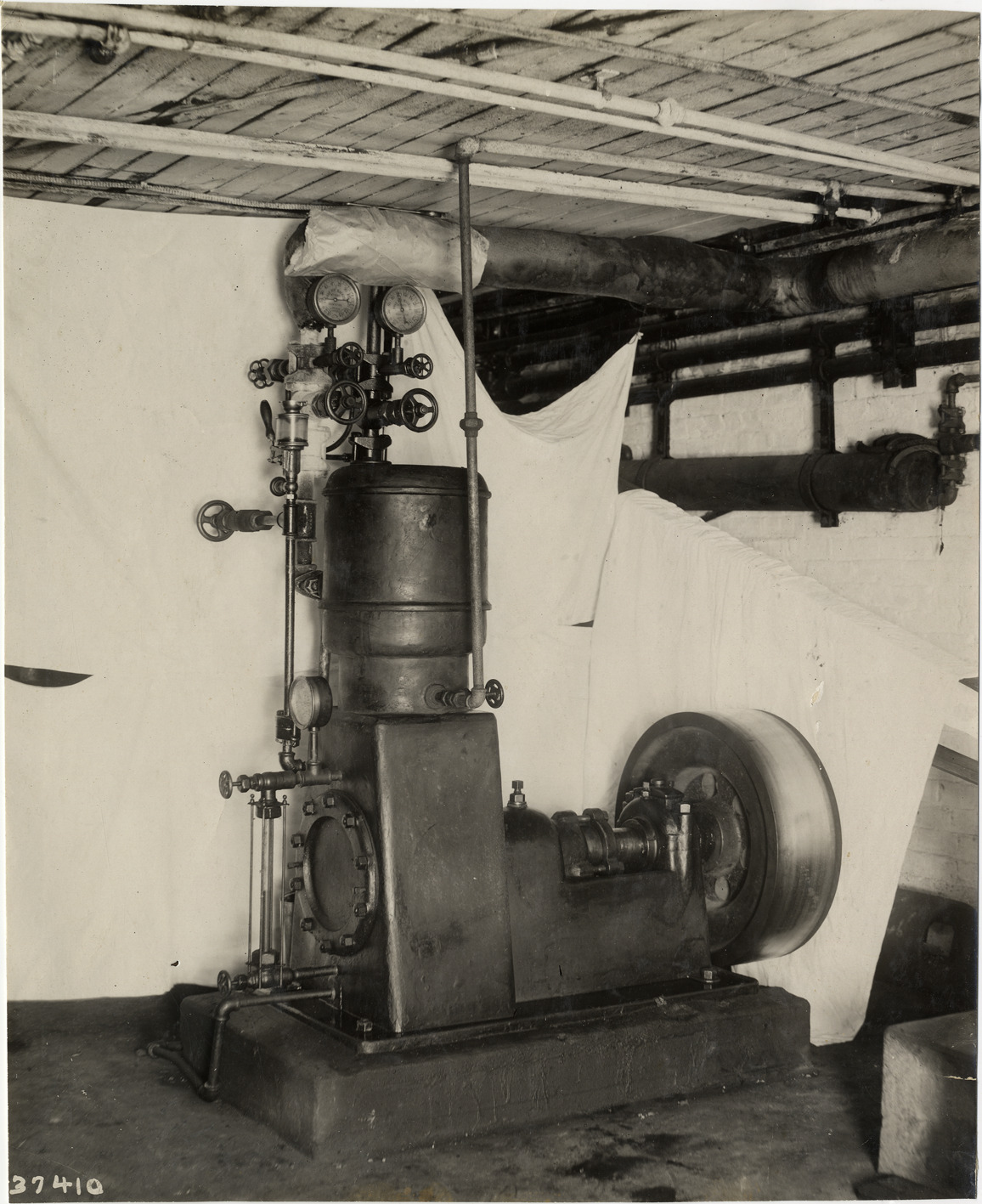 View of unidentified machinery in front of backdrop. Stamped on back: "Spooner & Wells, Inc., photographers, telephones 3472-3473 Columbus, 1931 Broadway, New York." Handwritten on back: "Machinery, 1910."