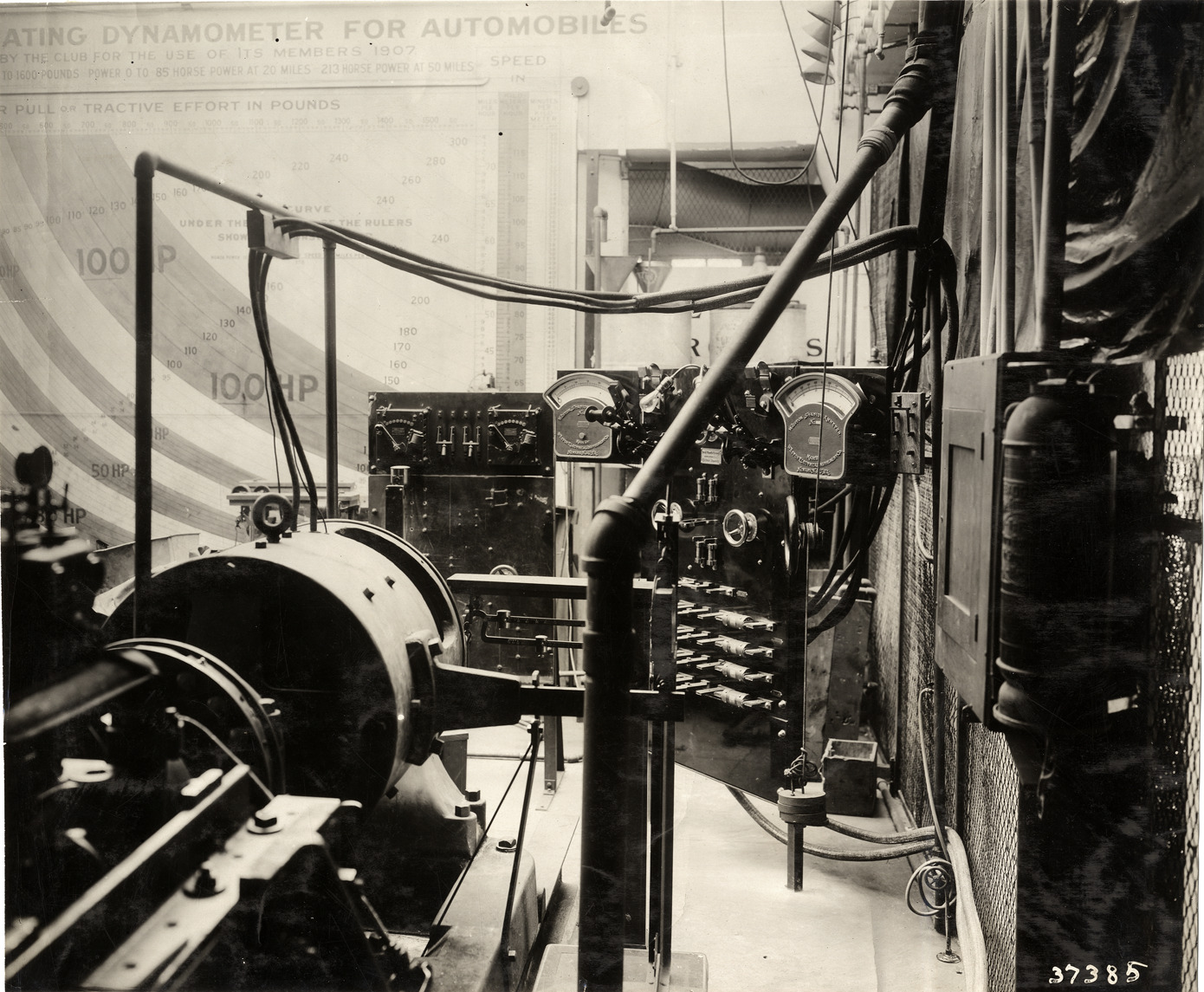 View of gauge panel and ammeters, possibly part of the Absorption and Indicating Dynamometer constructed by the Automobile Club of America for its members. Sign and chart on rear wall reads: "[Absorption and indic]ating dynamometer for automobiles ... by the club for use of its members, 1907." Stamped on back: "Spooner & Wells, Inc., photographers, telephone North 1745. 1231 Woodward Ave., Detroit, Mich. Detroit, 1231 Woodward, New York, 1931 Broadway." Handwritten on back: "Machinery--Electrical, 1910."