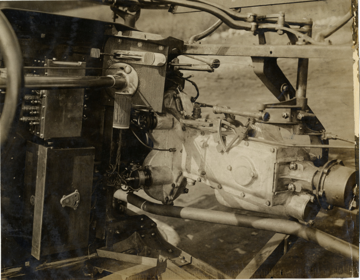 Close-up view of 1906 Maxwell car chassis, turned on its side, showing transmission. Handwritten on back: "Maxwell, 1906."