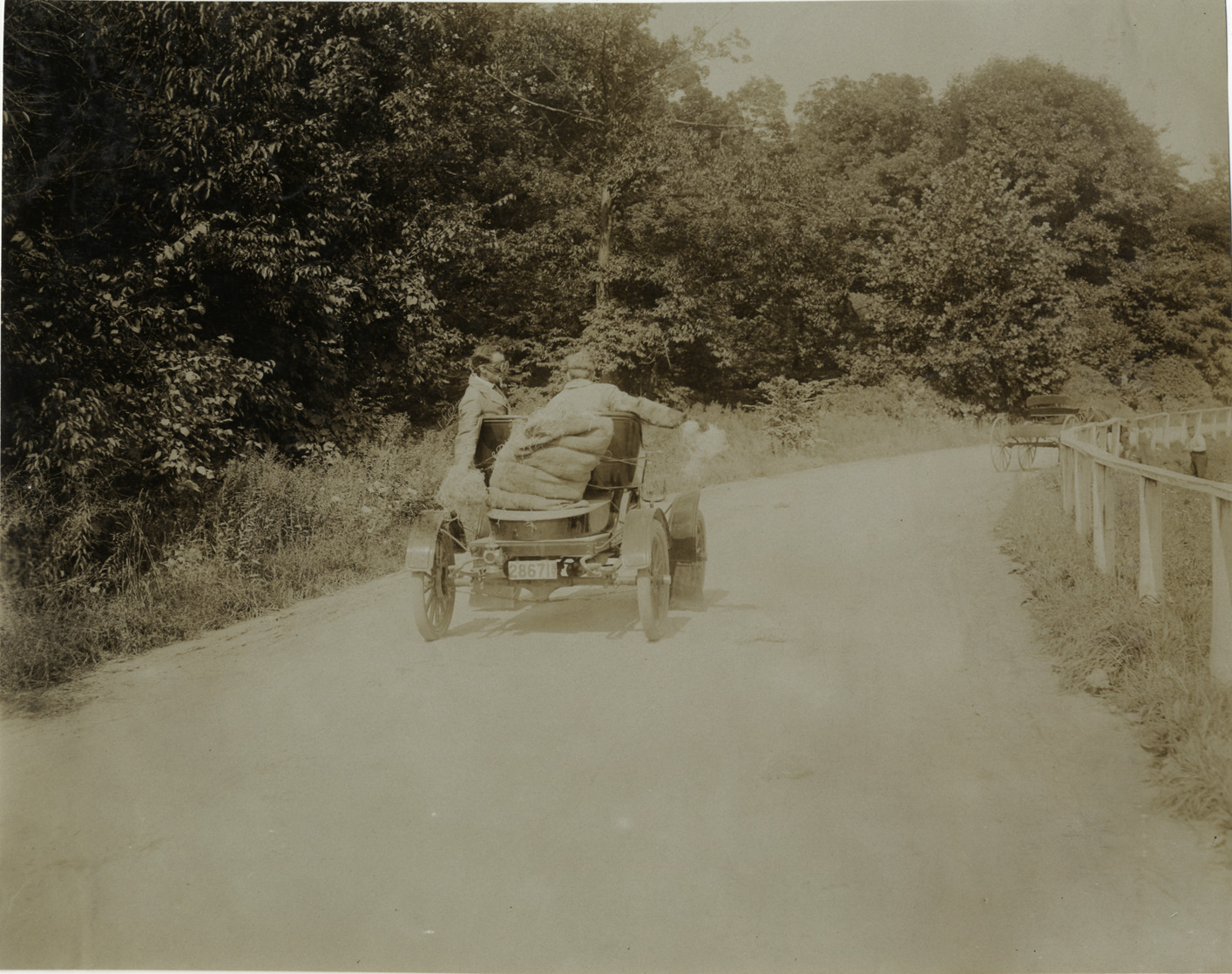 Favorite this☆ Motorists in 1907 Maxwell automobile Description: Rear view of motorists in 1907 Maxwell car, traveling on rural road. Men scatter straw on road from burlap bag on rear of car. Handwritten on back: "Maxwell, 1907." Details Resource ID: na009062 Subject: Automobiles Maxwell-Briscoe Motor Company Photographic prints Date Issued: Unknown year Format: 1 photographic print ; 7.5 x 9.5 in. Member of: National Automotive History Collection Lazarnick Collection Filing Location: Maxwell #2 Rights: Physical rights are retained by DPL. Copyright is retained in accordance with U.S. copyright laws.