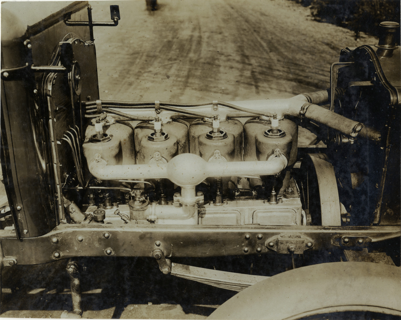 Close-up view of 1906 Maxwell car engine. Handwritten on back: "Maxwell, 1906."