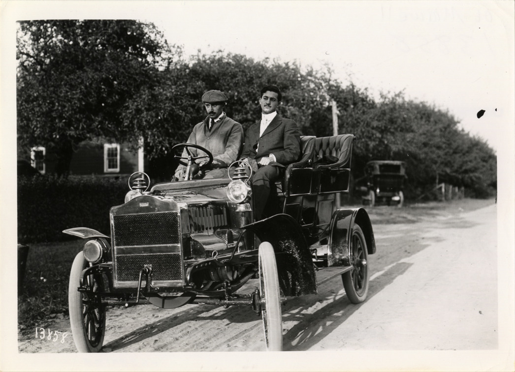 View of driver and passenger in Maxwell car. Handwritten on back: "Maxwell, c.1906."