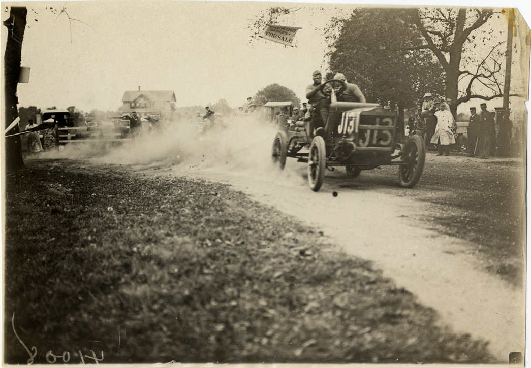 View of driver and passenger racing Maxwell car no. J13; spectators watch from roadside. "Parking spaces for sale" sign suspended overhead. Stamped on back: "Spooner & Wells, Inc., photographers, telephones 3472-3473 Columbus, 1931 Broadway, New York." Handwritten on back: "Maxwell, 1906."