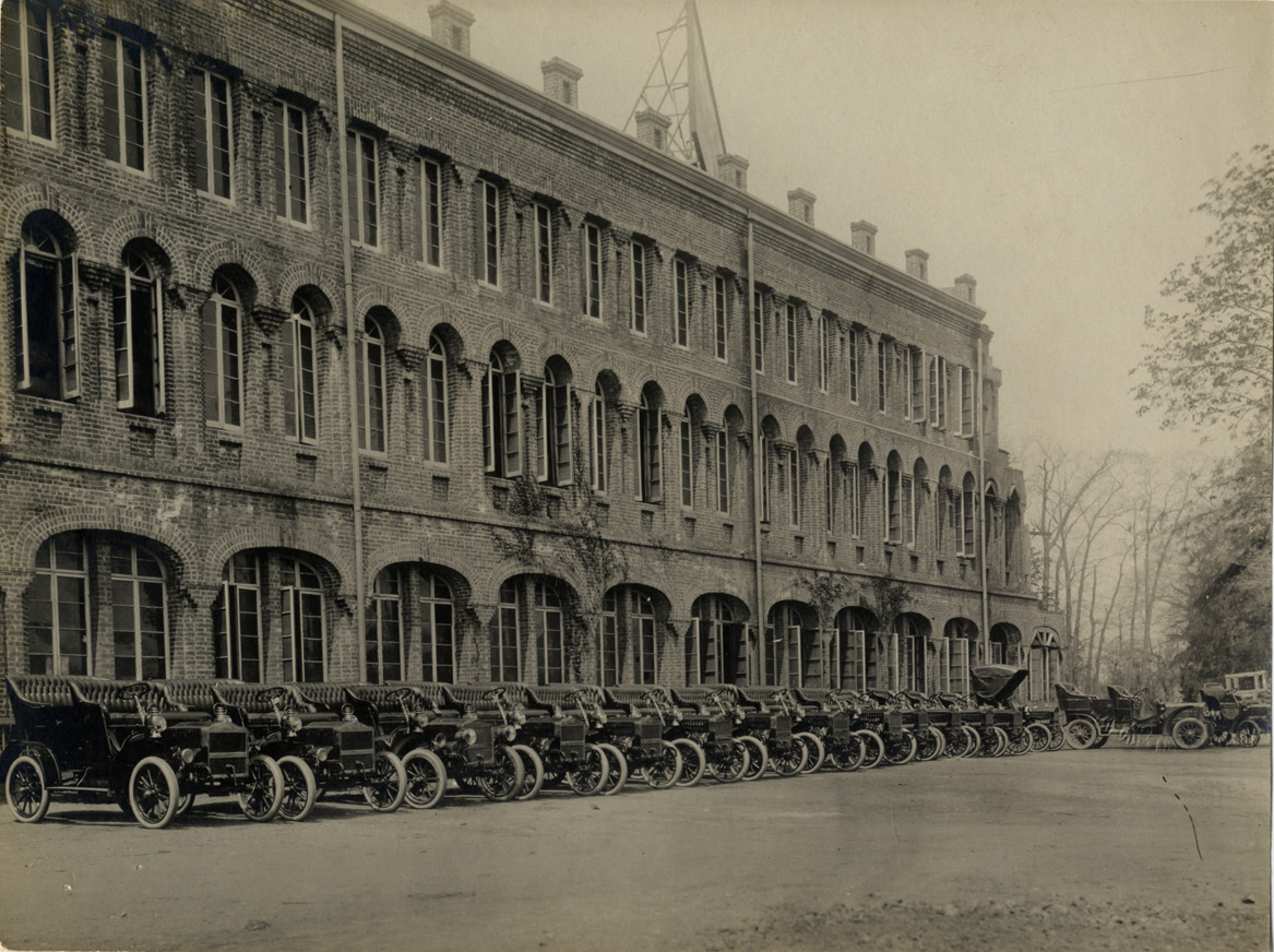View of row of Maxwell cars, parked in front of unidentified brick building. Stamped on back: "Photo by N. Lazarnick, 29 West 42nd Street, New York." Handwritten on back: "Maxwell, c.1906."