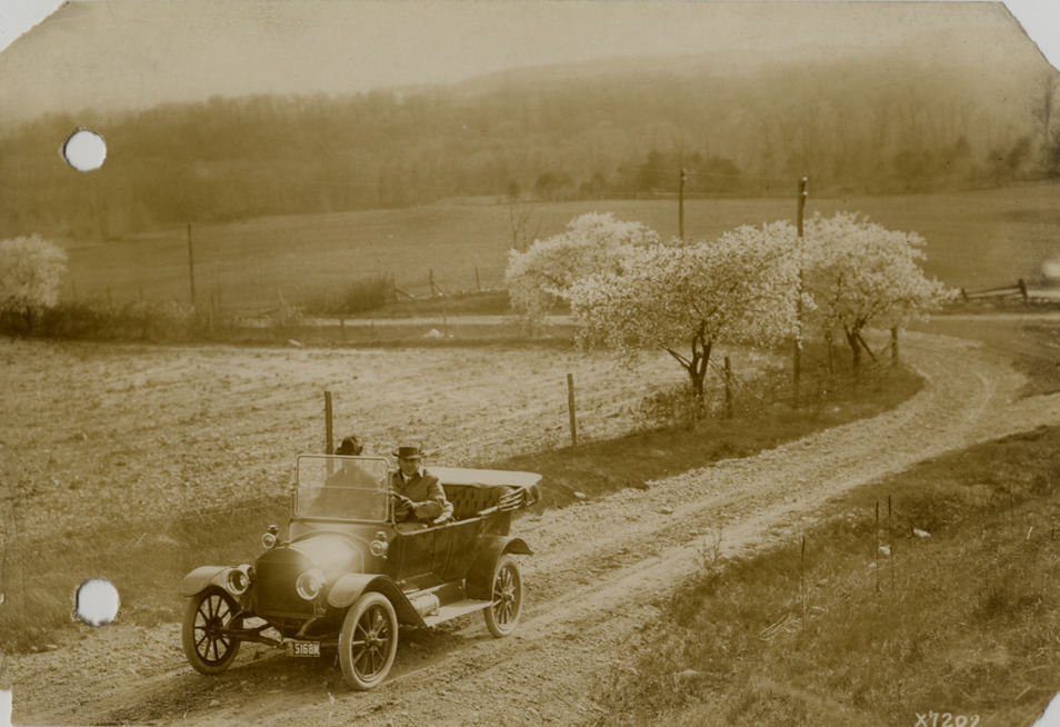 View of driver and passenger in 1913 Maxwell car, traveling on rural road. Handwritten on back: "Maxwell, 1913. Car on road for Maxwell Motor Co."