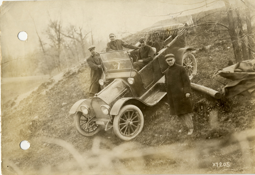 Motorists posing with 1913 Maxwell automobile on hillside