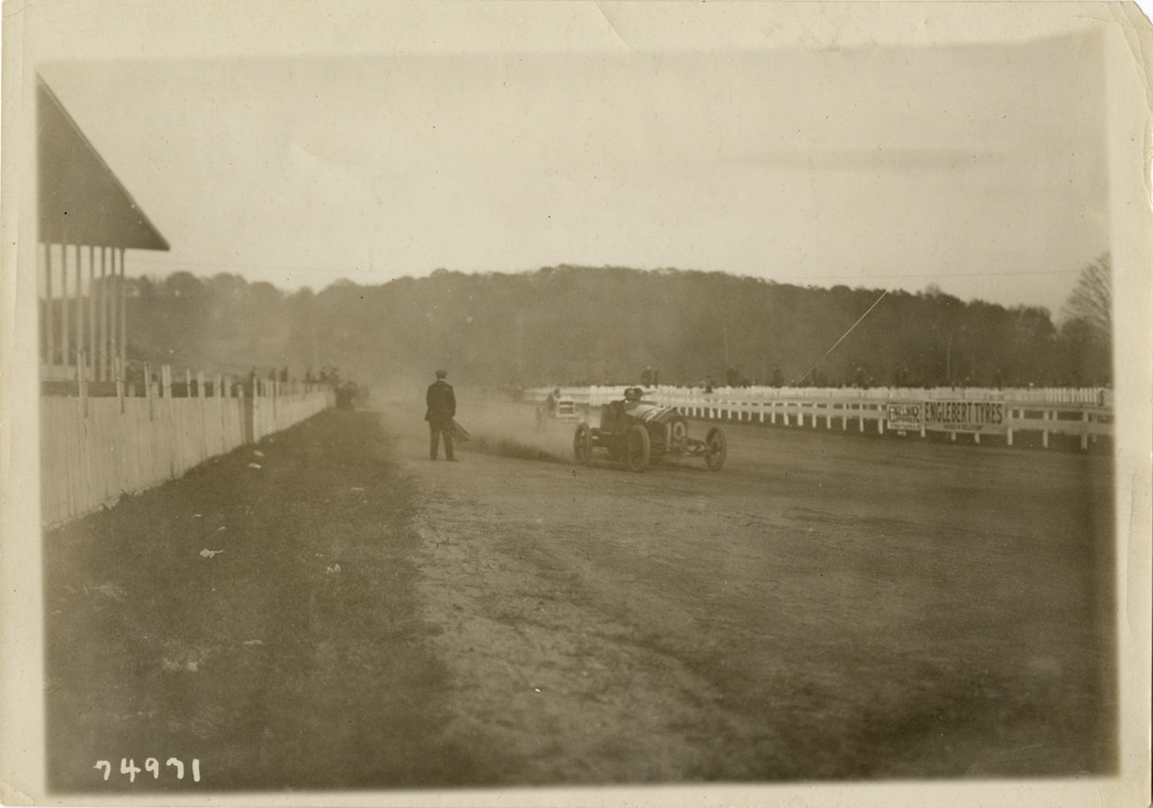 View of Mercer car no. 19 racing on track, followed by another car. Official holding flag stands in center of track; "Englebert tyres" sign on railing. Stamped on back: "Spooner & Wells, Inc., photographers, 1931 Broadway, N.Y. City, phones 3472-3473 Col." Handwritten on back: "Mercer, c.1912."