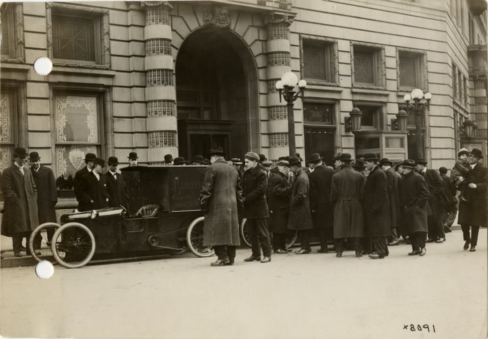 View of crowd gathering around 1914 Mercury cyclecar parked in front of Hotel Pontchartrain in Detroit, Michigan. Handwritten on back: "Mercury, 1914. Detroit, MI, cyclecar."